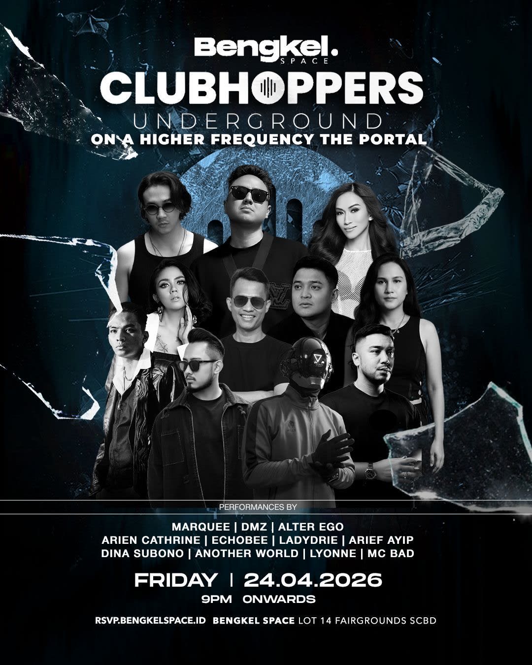 CLUBHOPPERS UNDERGROUND 24.04.2026 09 PM onwards On a higher frequency. Enter the portal. Limited access. RSVP now : rsvp.bengkelspace.id